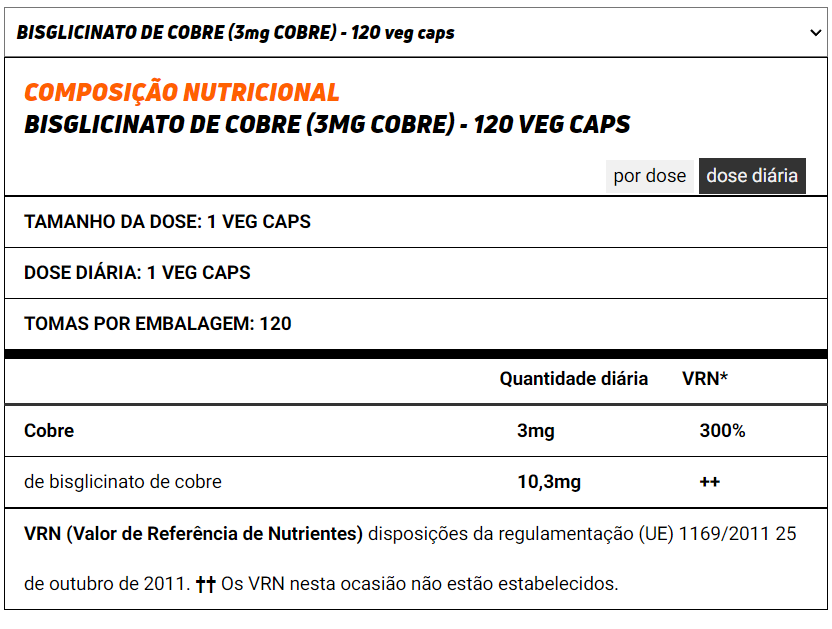 O cobre é um oligoelemento essencial do organismo cuja ingestão de referência é de 1mg por dia. de acordo com a regulamentação europeia.